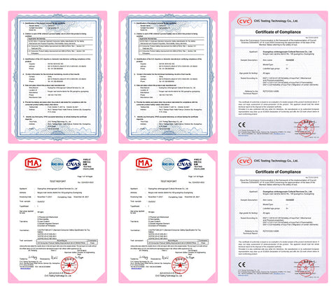Säkerhet är alltid prioritet när det gäller leksaker för barn. Vi har erhållit certifikat för tester som omfattar hälso-, säkerhets- och miljökrav, såsom EN71, ASTM F963, EU-CE.